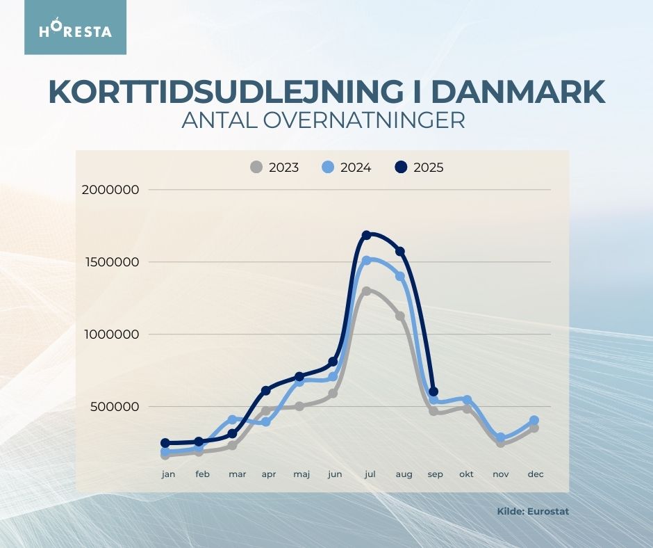 Korttidsudlejningen til turister fylder mere og mere i det danske overnatningsmarked og sætter ny rekord. Nye tal fra Eurostat, som HORESTA har analyseret, viser, at der i de første tre kvartaler af 2025 er registreret 6,8 mio. overnatninger i Danmark via udlejningsplatforme.